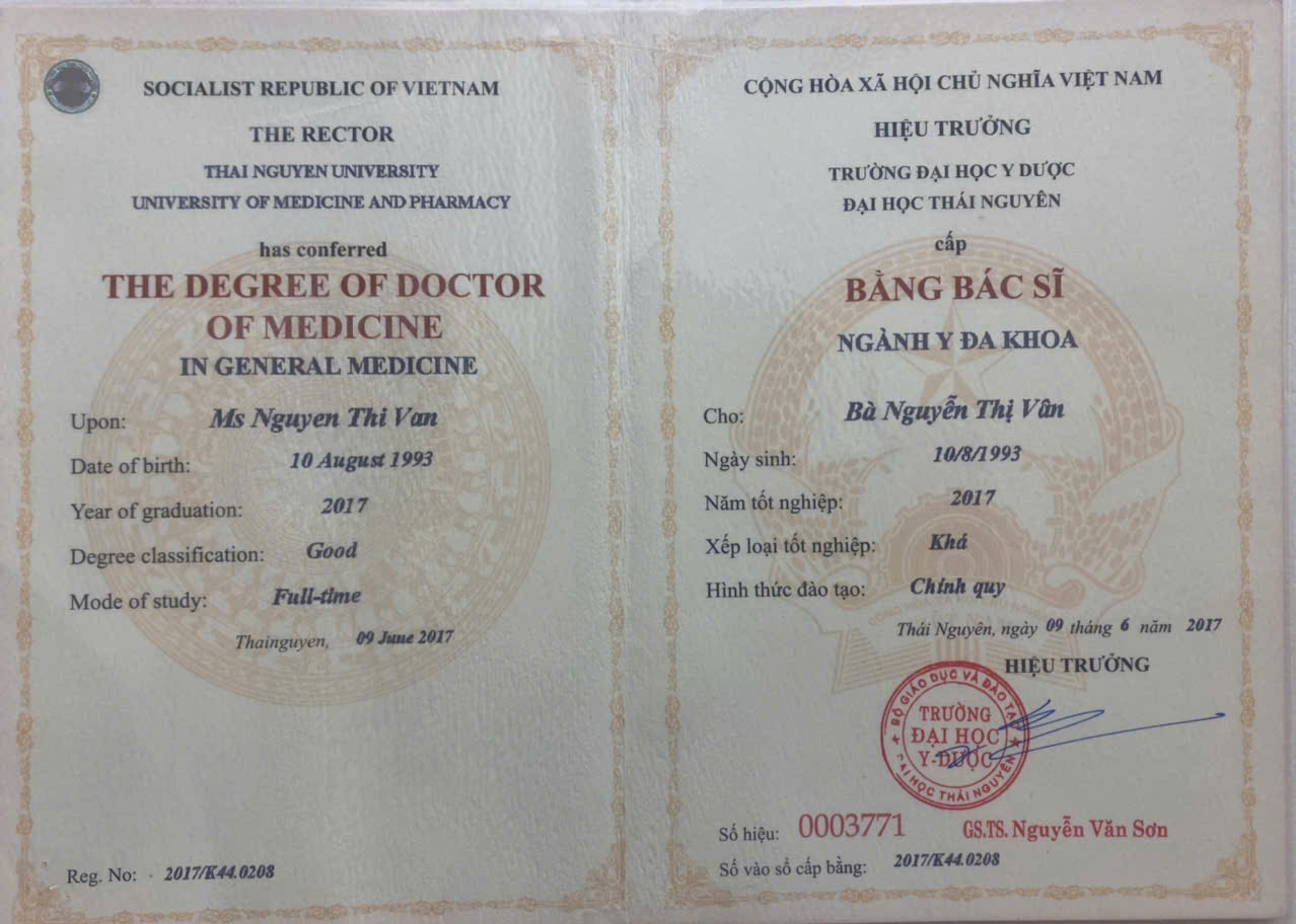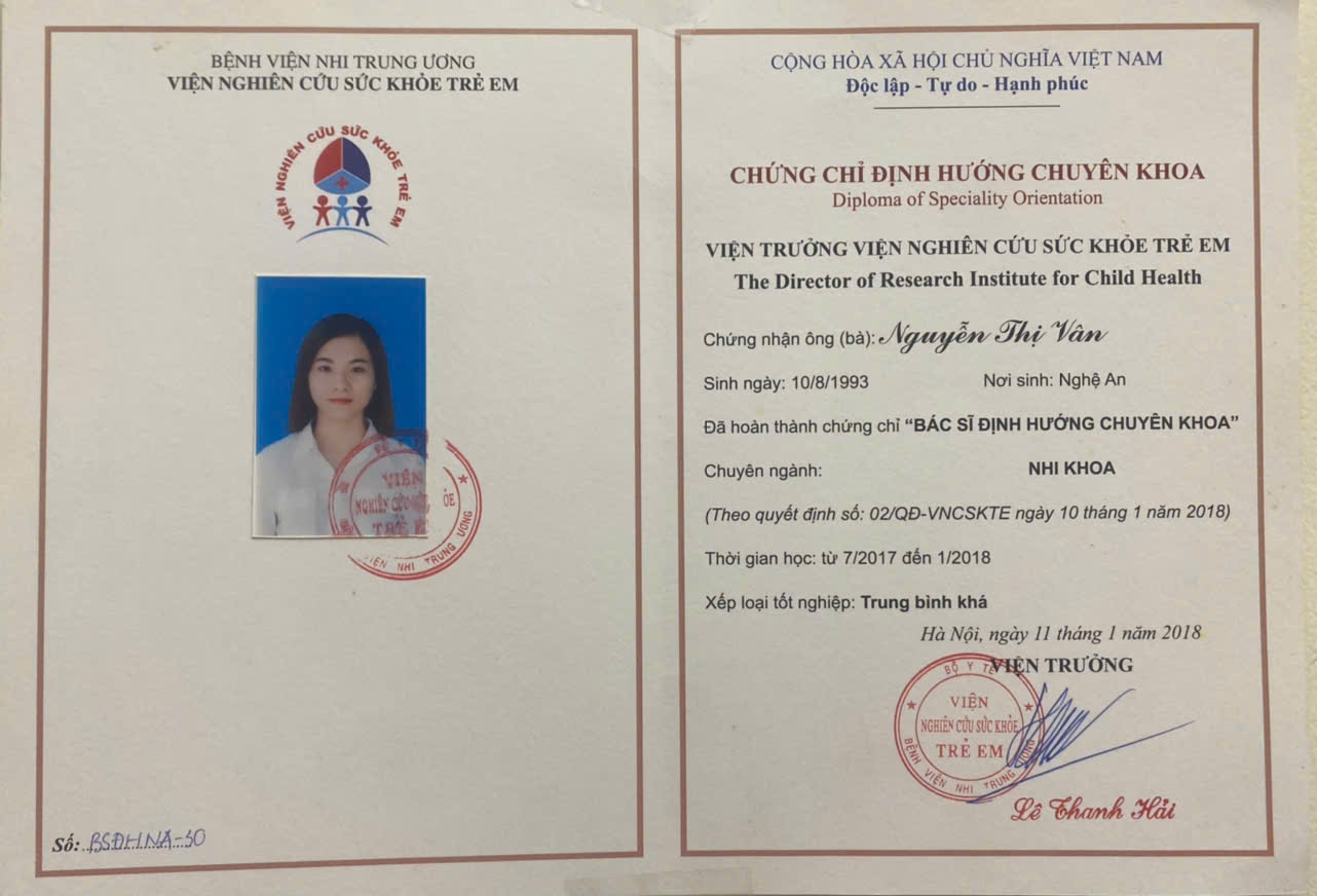 Học vấn: Bác sĩ định hướng chuyên khoa tại BV NHI TW, Bác sĩ ngành y đa khoa tại Trường Đại Học Y Dược Đại Học Thái Nguyên