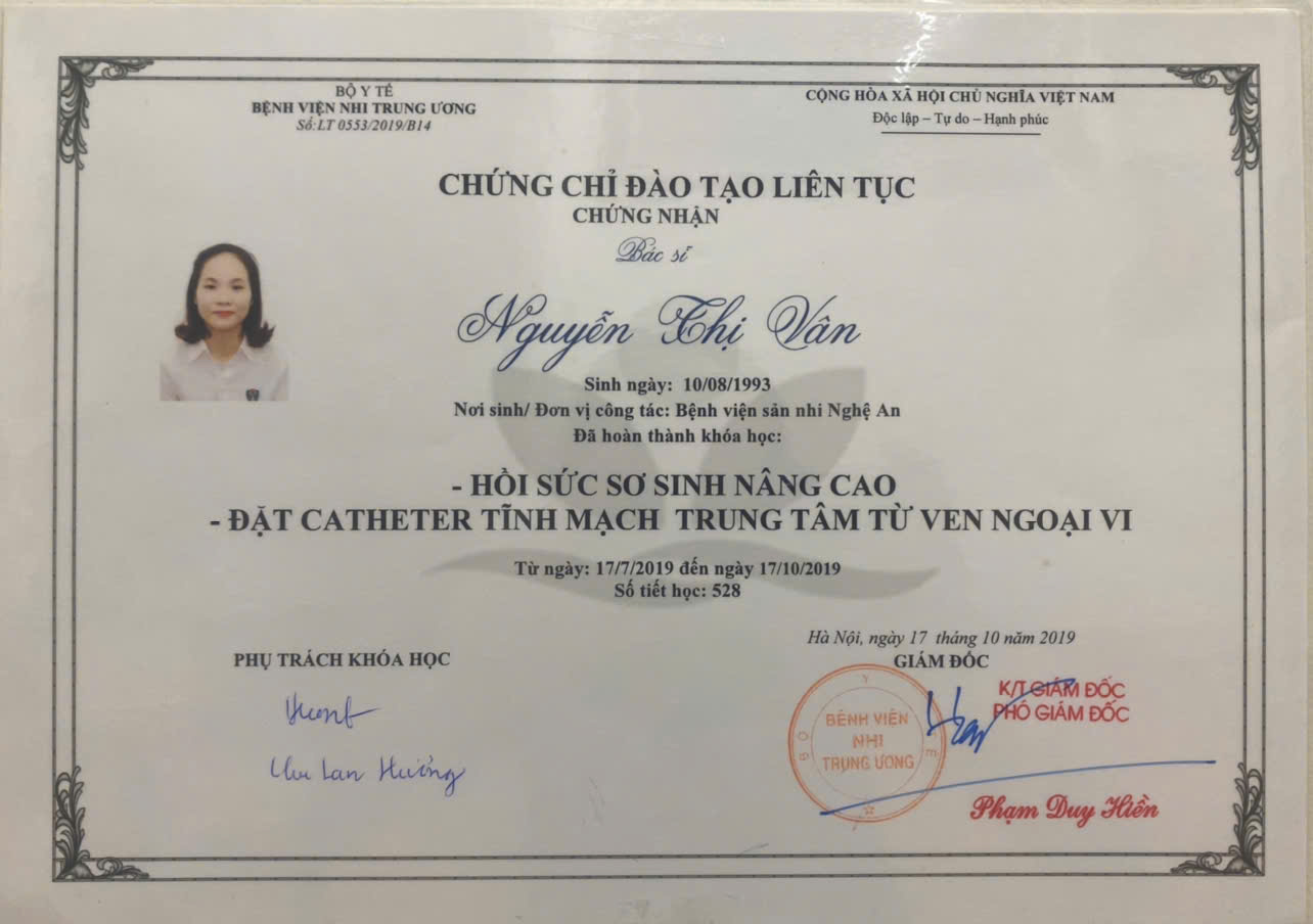 Lĩnh vực chuyên môn: Khám chữa bệnh nội nhi, Hồi sức sơ sinh nâng cao – đặt CATHETER Tĩnh Mạch trung tâm từ ven ngoại vi.